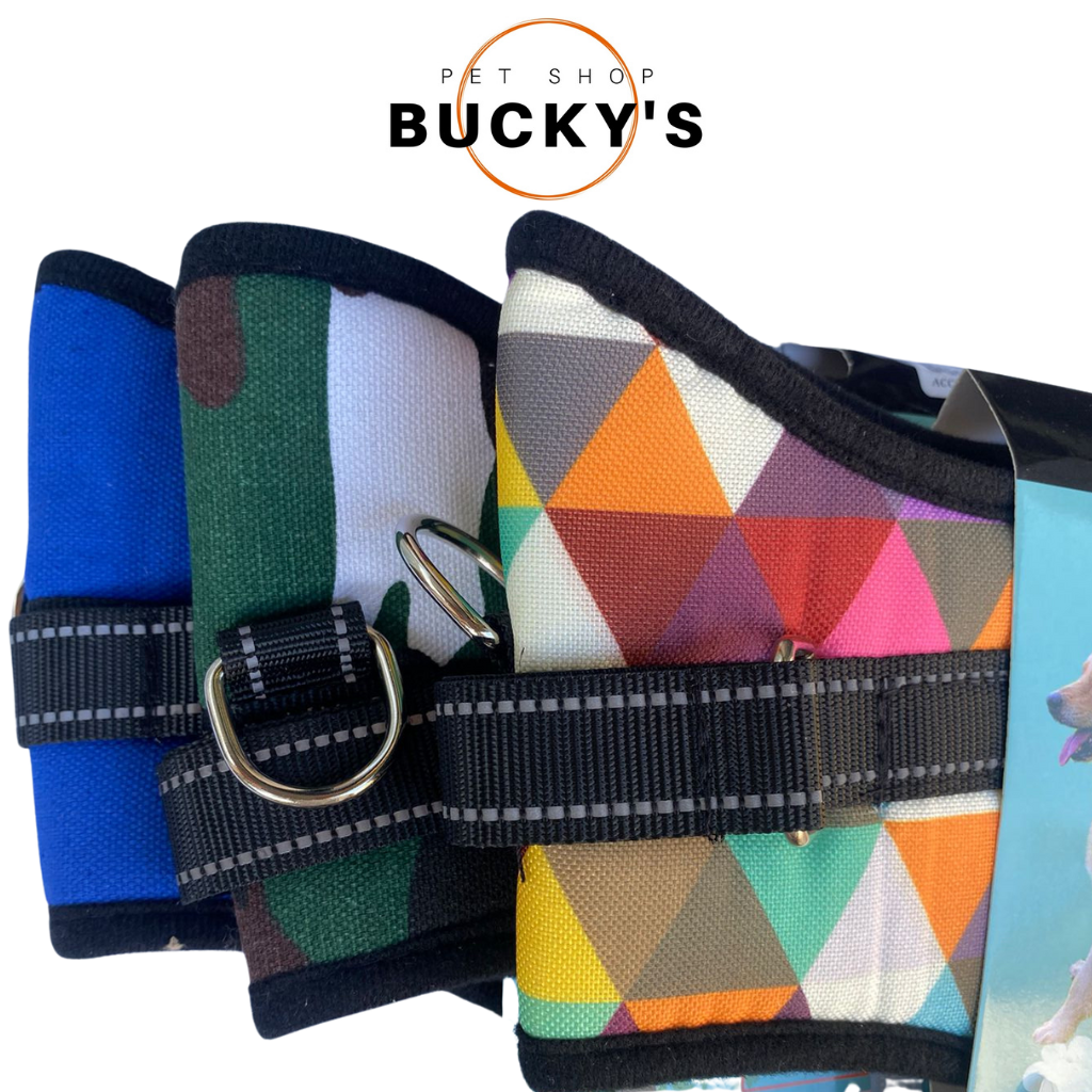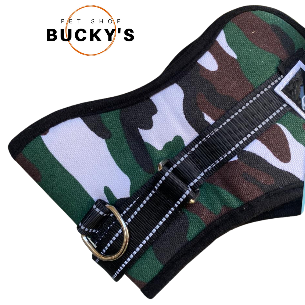 Totalmente ergonómico y extra robusto, está acolchado en su interior y es el único arnés que se coloca sin levantar las patas del perro, ya que se mete por el cuello y se cierra mediante un sistema de clip de seguridad.