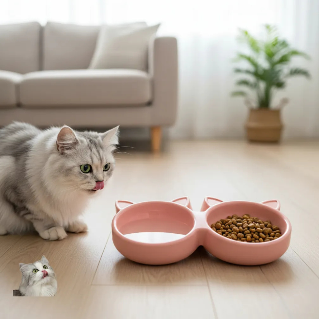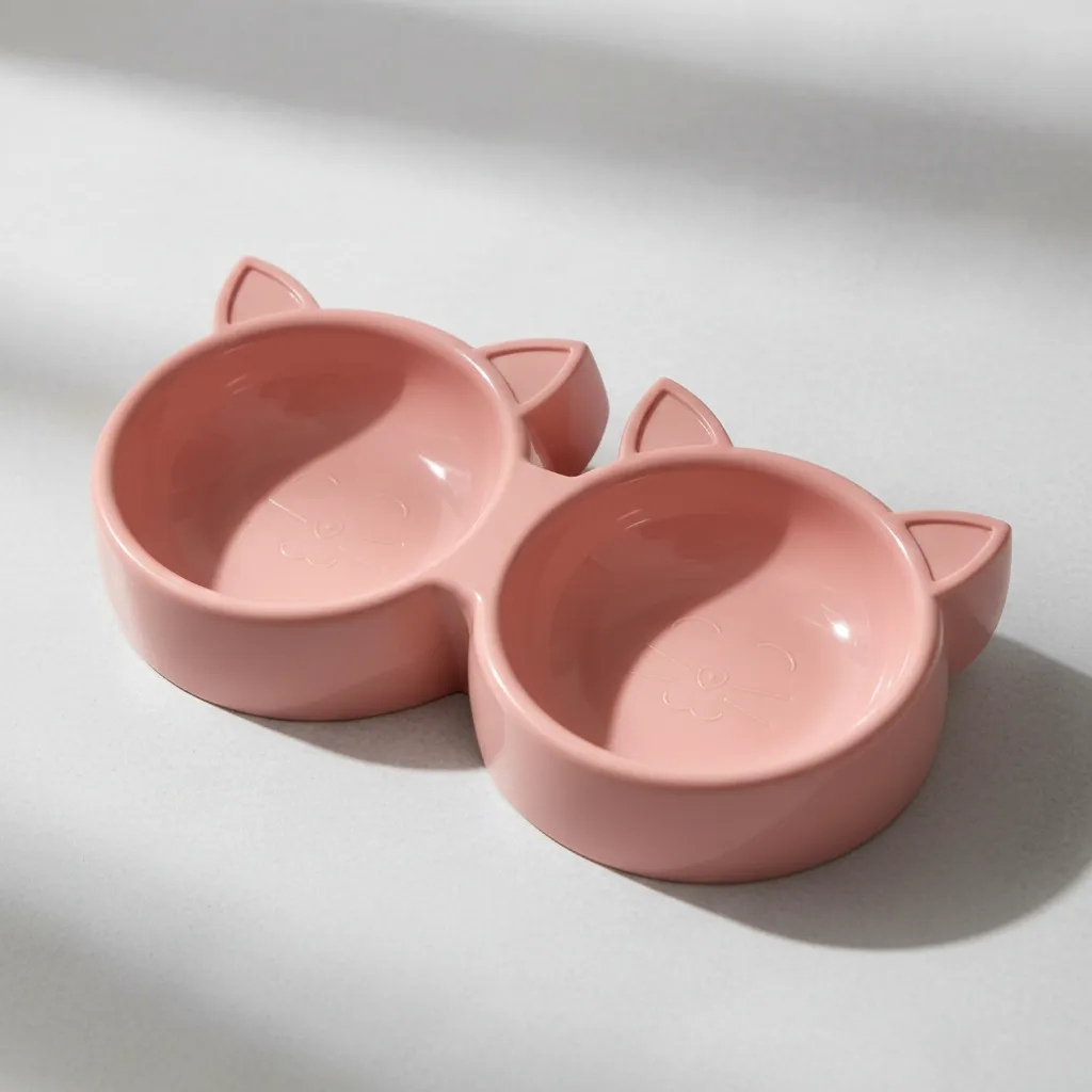 Comedero doble plástico con orejas para gatos y mascotas pequeñas. Su diseño divertido en forma de carita con orejas y doble compartimento lo hace ideal para servir agua y alimento al mismo tiempo. Funcional, liviano y fácil de limpiar, es perfecto para el uso diario en casa o para llevar en salidas.