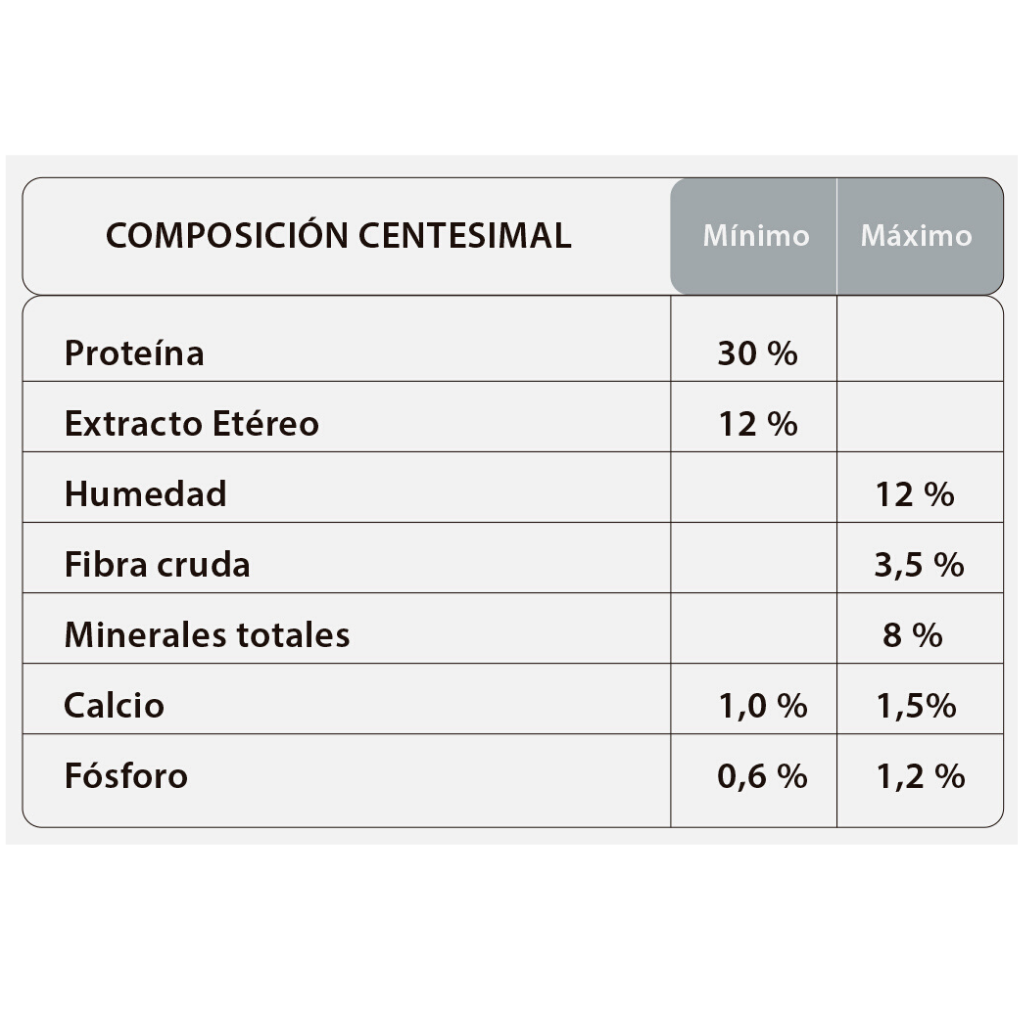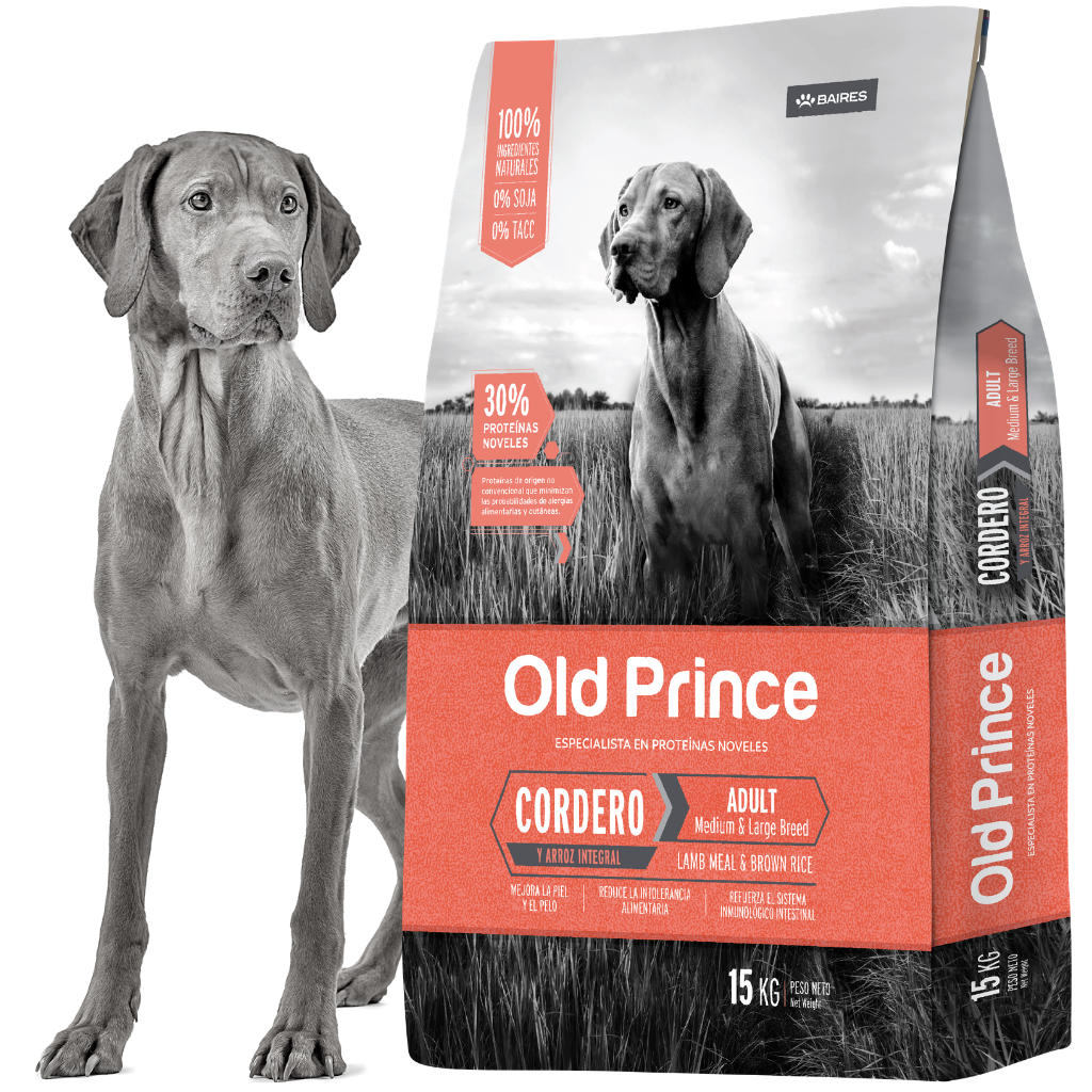 Ingredientes: Harina de cordero, arroz integral, arveja, gluten de maíz, germen de maíz desgrasado, grasa animal (pollo), aceite de salmón (fuente de omega 3 y 6), hidrolizado proteico de menudencias vacunas, porcinas y aviares, pulpa de remolacha (fuente de fructo-oligosacáridos- FOS), levadura de cerveza, zeolita, sal, extracto de yucca schidigera, manano-oligosacáridos – MOS, nucleótidos de levadura, carbonato de calcio, dipropionato de amonio, ácido propiónico, acetato de zinc, pirofosfato ácido de sodio, glucosamina, condroitin sulfato, colágeno hidrolizado, ascorbato de manganeso, metionina, antioxidantes naturales: extracto de romero, vitamina C, betacaroteno, ácido cítrico, tocoferoles, licopeno, luteína, polifenoles, taurina, vitaminas: A, D3, E, K, B1, B2, B6, B12, ácido fólico, ácido nicotínico, ácido pantoténico, biotina, colina, minerales: zinc, hierro, cobre, yodo, selenio.